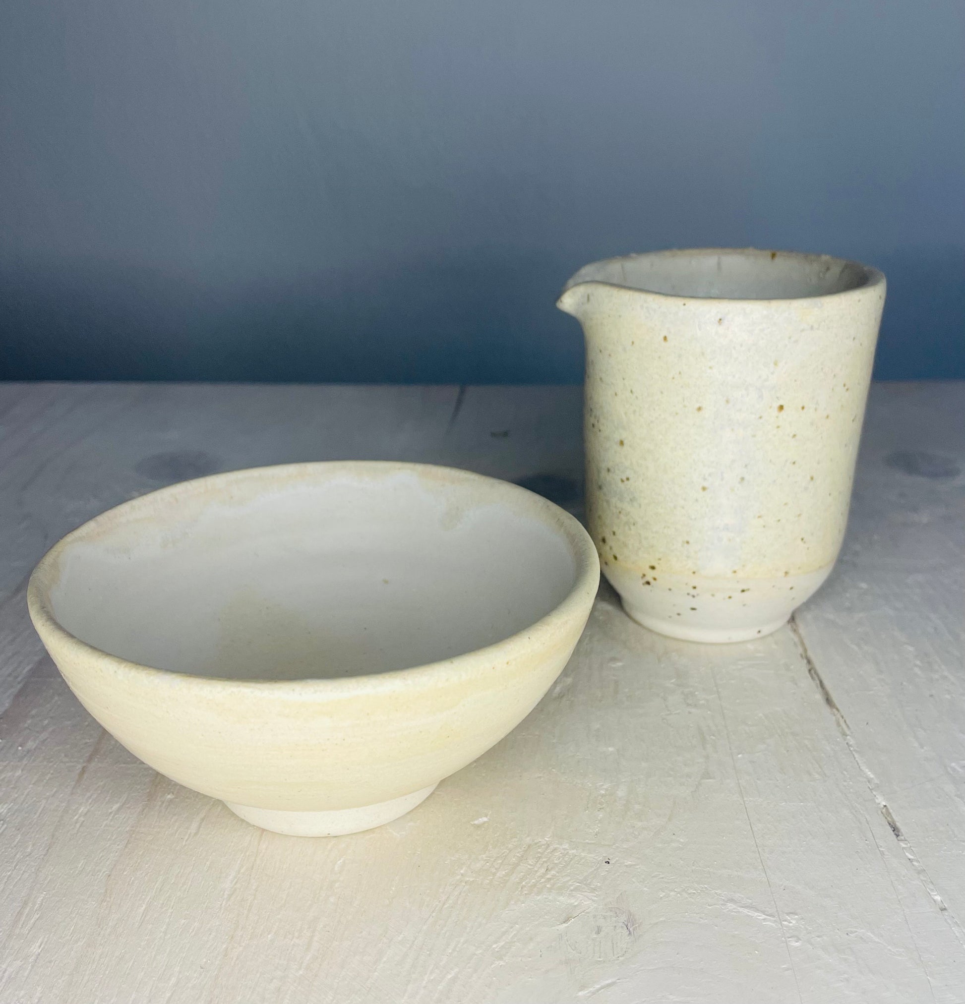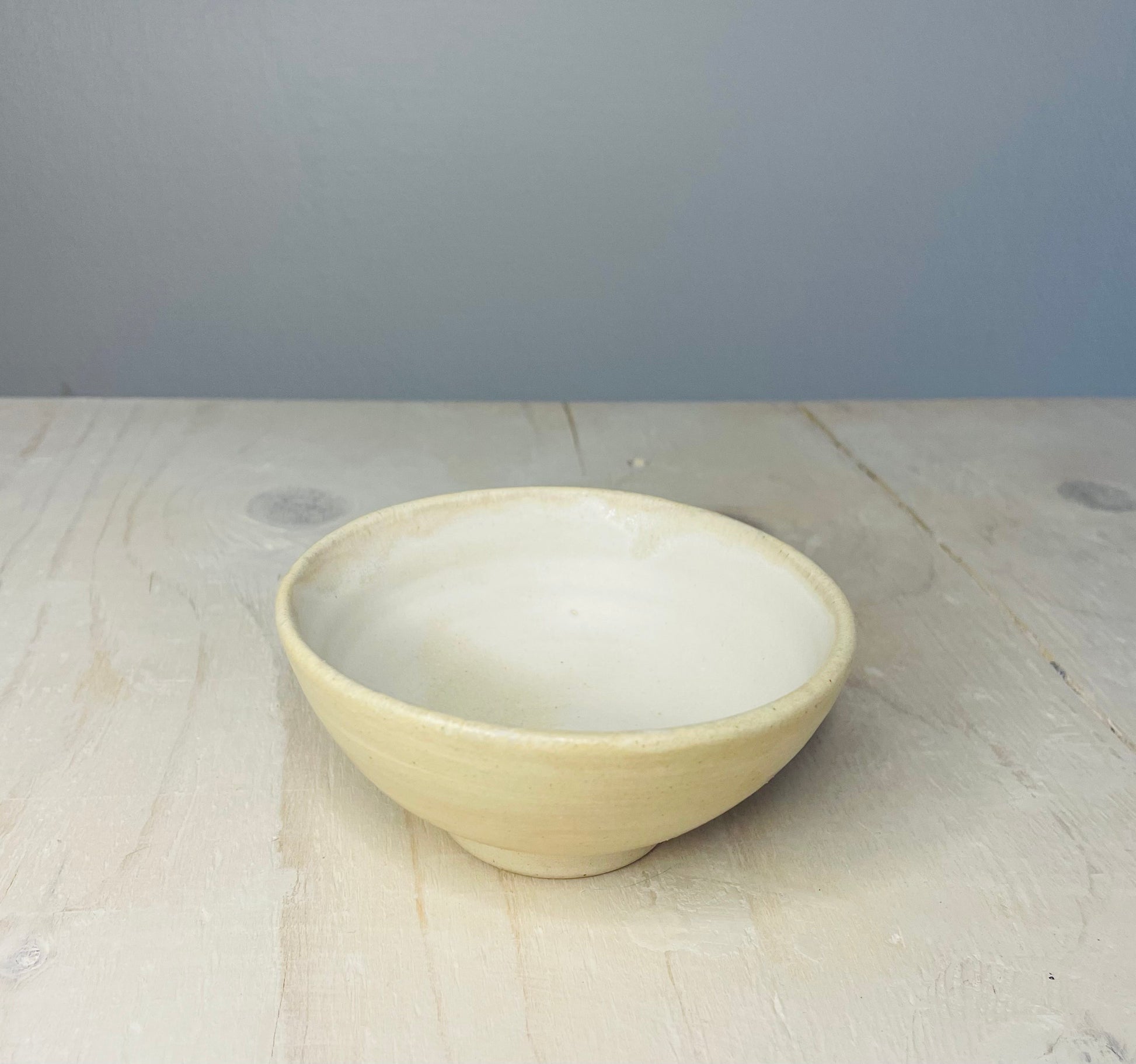 Handgjord och mindre avvikelser i färg och storlek förekommer. Rymmer ca 2,5 dl. Höjd 5 cm, diameter 13 cm.