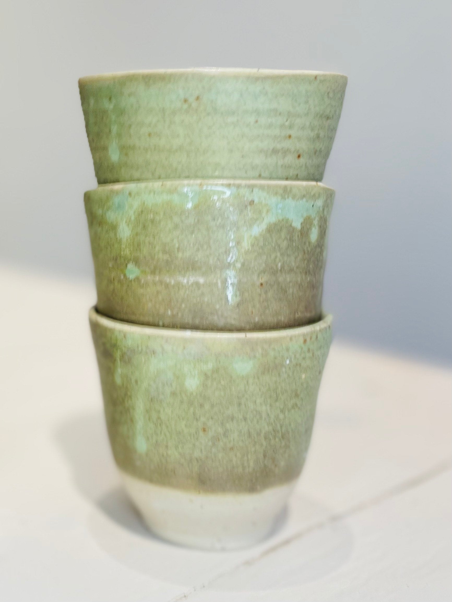 Kopp utan öra. Handgjord och mindre avvikelser i färg och storlek förekommer. Rymmer ca 2,5 dl. Höjd 8 cm, diameter 8 cm.