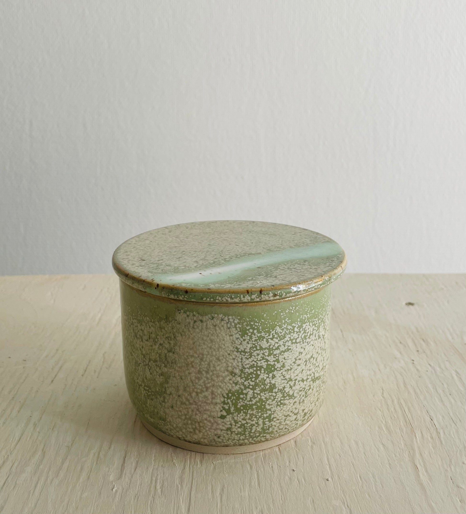 Rymmer ca 300ml, alltså ca ett halvt smörpaket. Höjd 10 cm, diameter 10 cm.