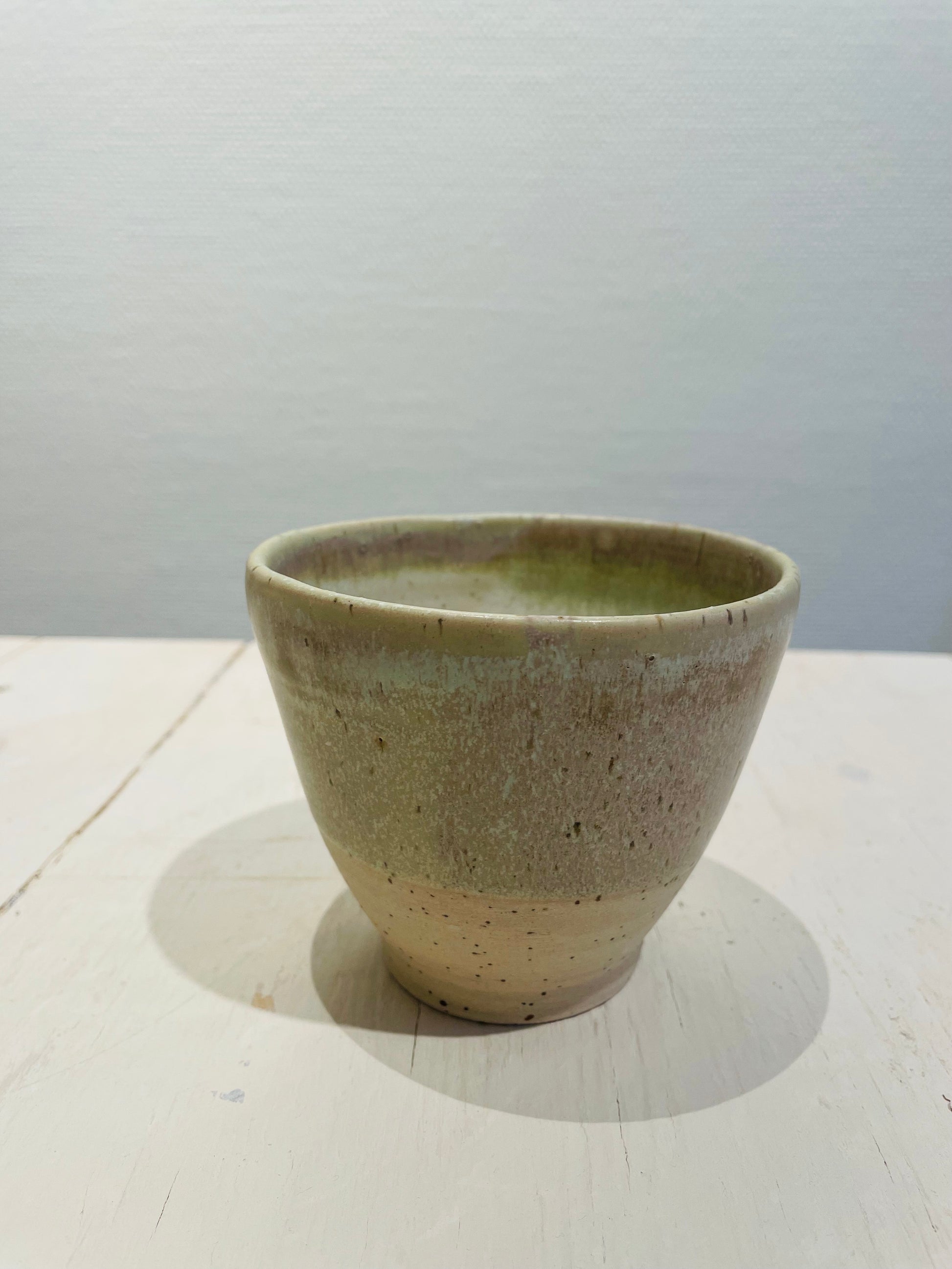 Kopp utan öra. Handgjord och mindre avvikelser i färg och storlek förekommer. Rymmer ca 4 dl. Höjd 11 cm, diameter 10 cm.
